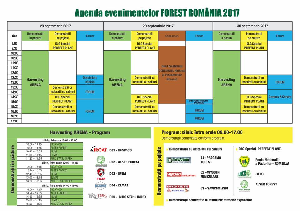 Editia a doua a targului Forest Romania se va desfasura in perioada 28-30 septembrie 2017. Programul evenimentului include un targ forestier desfasurat in aer liber, demonstratii practice in padure si conferinte pe teme de interes din domeniul forestier. Targul se va desfasura in intervalul orar 09:00-17:00 in toate cele trei zile. Pretul unui bilet de o zi la Forest Romania este de 40 de lei.