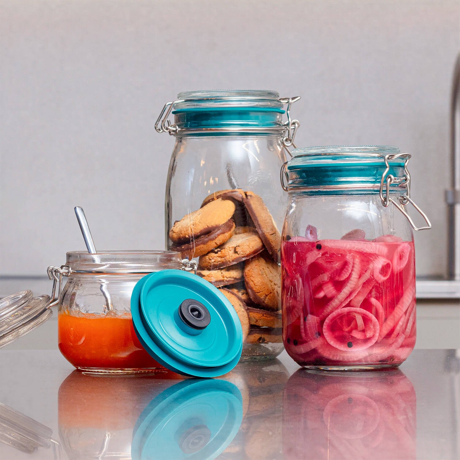 Transformati borcanele Clip Top in borcane de depozitare in vid cu capacele de vid Airtender. Borcanele Clip Top exista de peste 200 de ani si se gasesc in fiecare bucatarie si gospodarie. Peste tot in lume, borcanele de depozitare sunt folosite pentru a pastra continutul etans in scopul de a pastra alimentele proaspete mai mult timp.