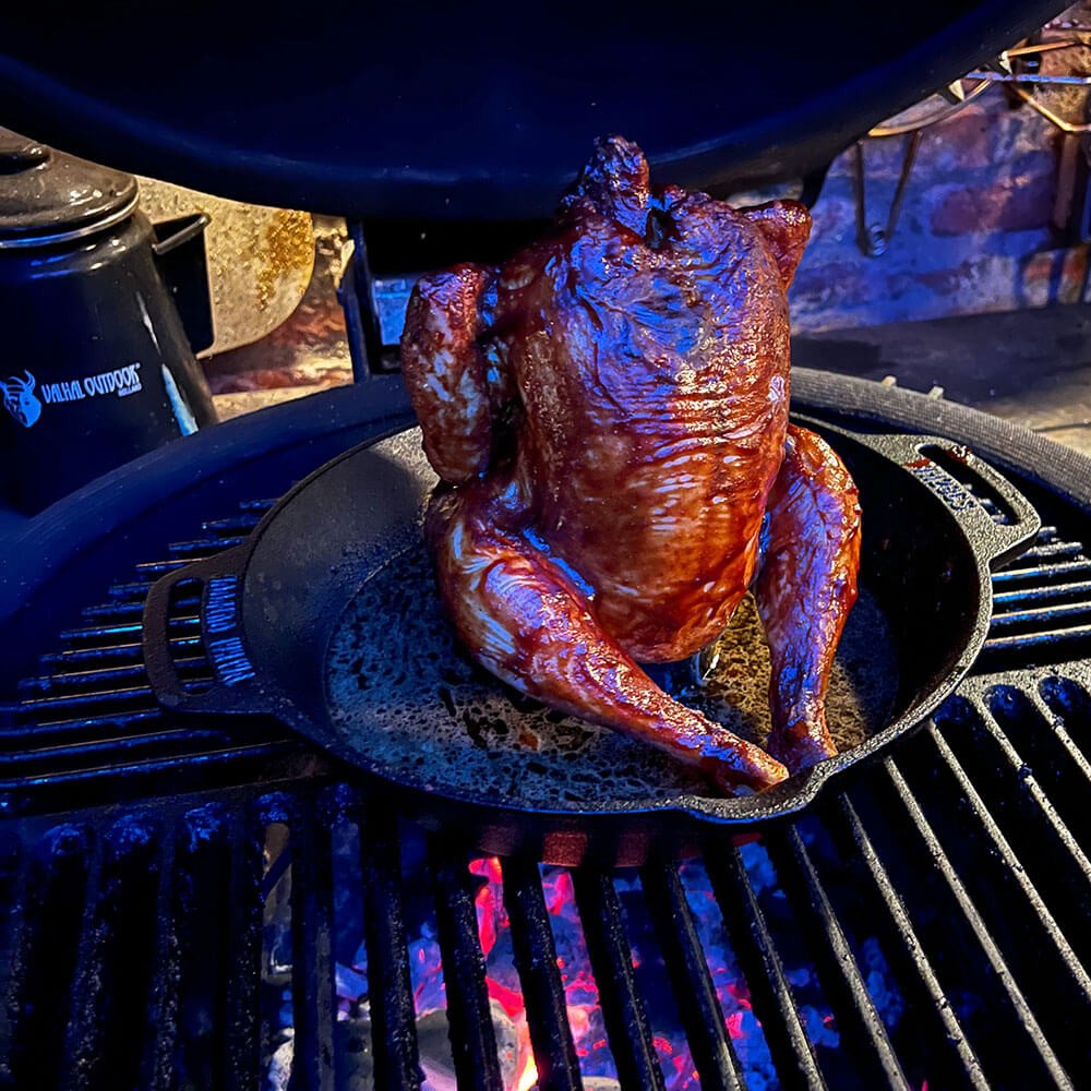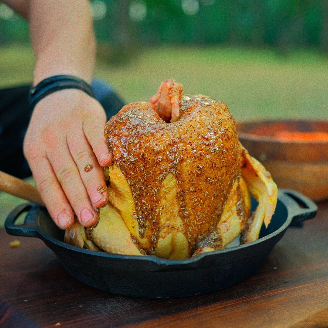 Fabricat din fontă premium pre-tratată, reține căldura și permite prepararea simultană a puiului și a garniturilor. Potrivit pentru cuptor, grătar sau foc deschis, este durabil și versatil.