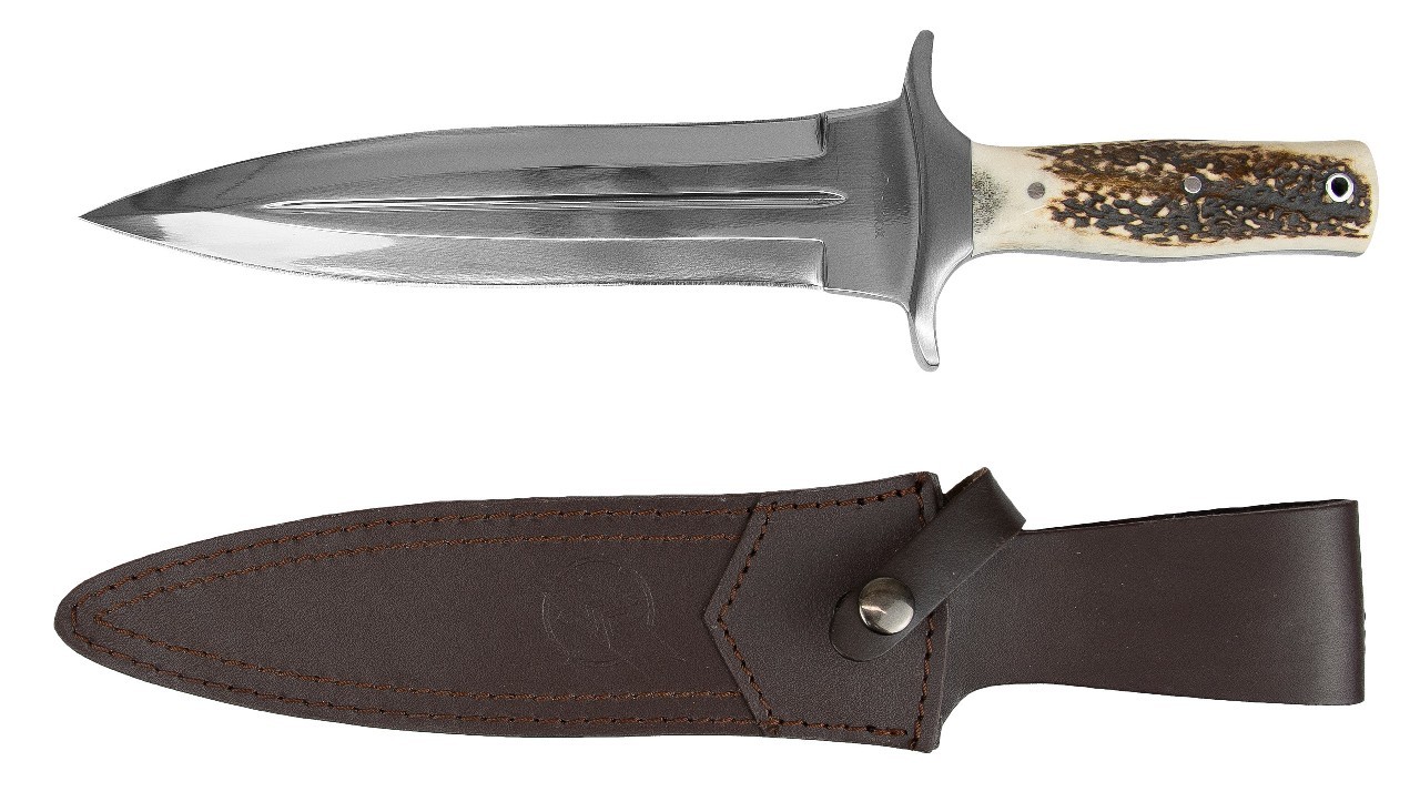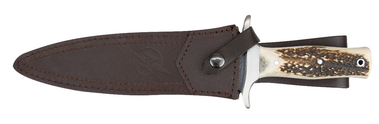 Cutit de vanatoare Guerrero Hirschhorn din otel inoxidabil 440 C cu o duritate de 57 HRC. Maner ergonomic din corn de cerb si aparatoare pentru mana.