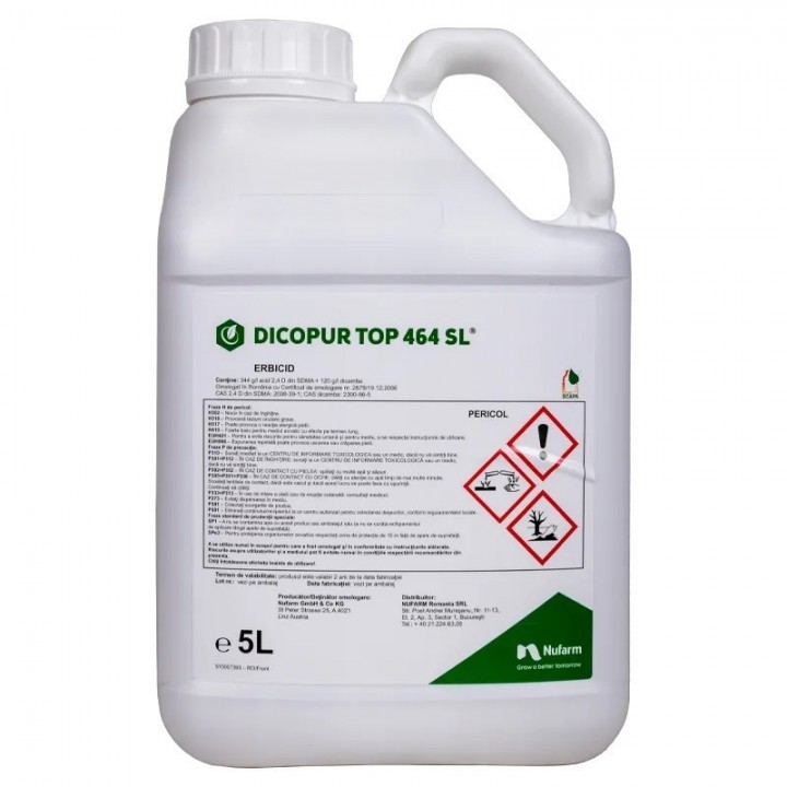 Dicopur Top 464 SL, este un erbicid selectiv si sistemic cu doua substante active ce actioneaza asupra buruienilor cu frunza lata anuale si perene atat la nivelul frunzelor cat si la nivel radicular.