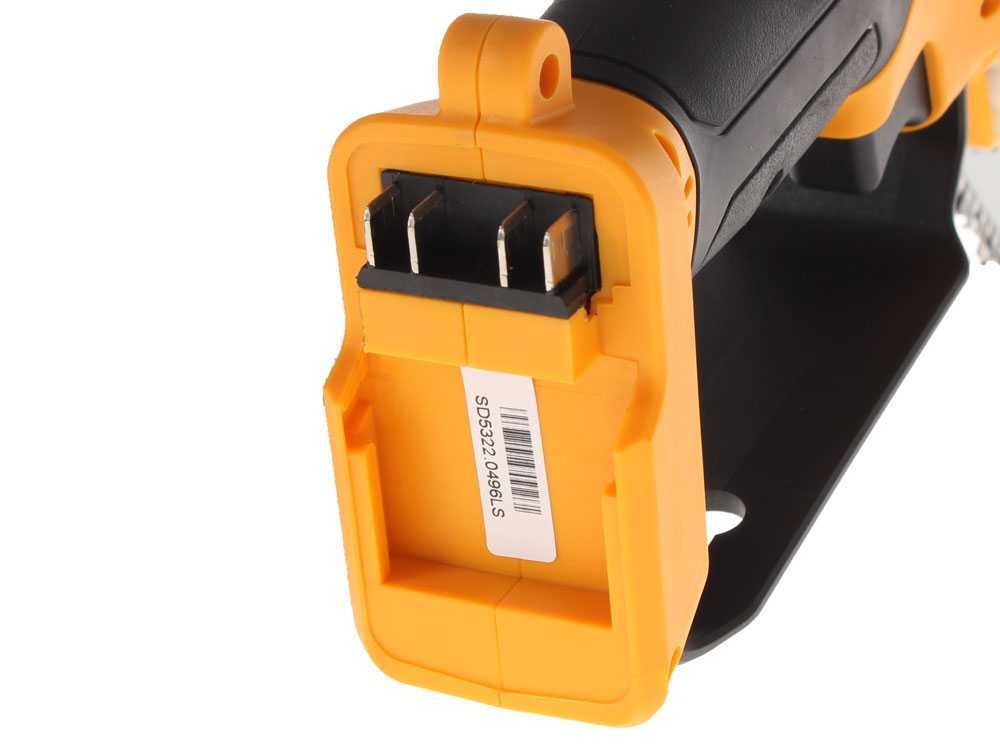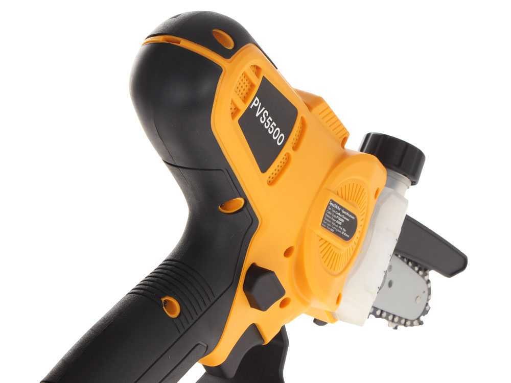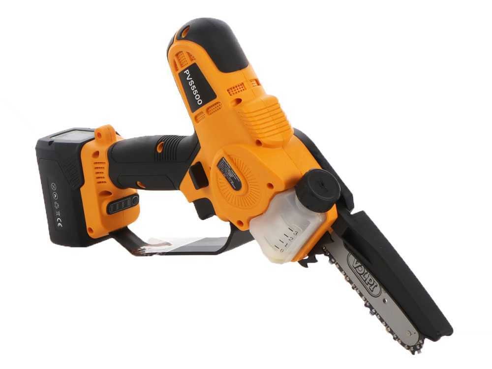 PVS5500 este drujba electronică echipată cu lanț de 1/4″, lamă de 5″, comutator dublu de siguranță și mâner ergonomic. Acest model este dotat cu un motor BRUSHLESS, cu o putere nominală de 650W și o tensiune nominală de 14,4 V DC. Rezervorul de ulei este integrat, iar ungerea este automată datorită pompei electronice de ulei.
