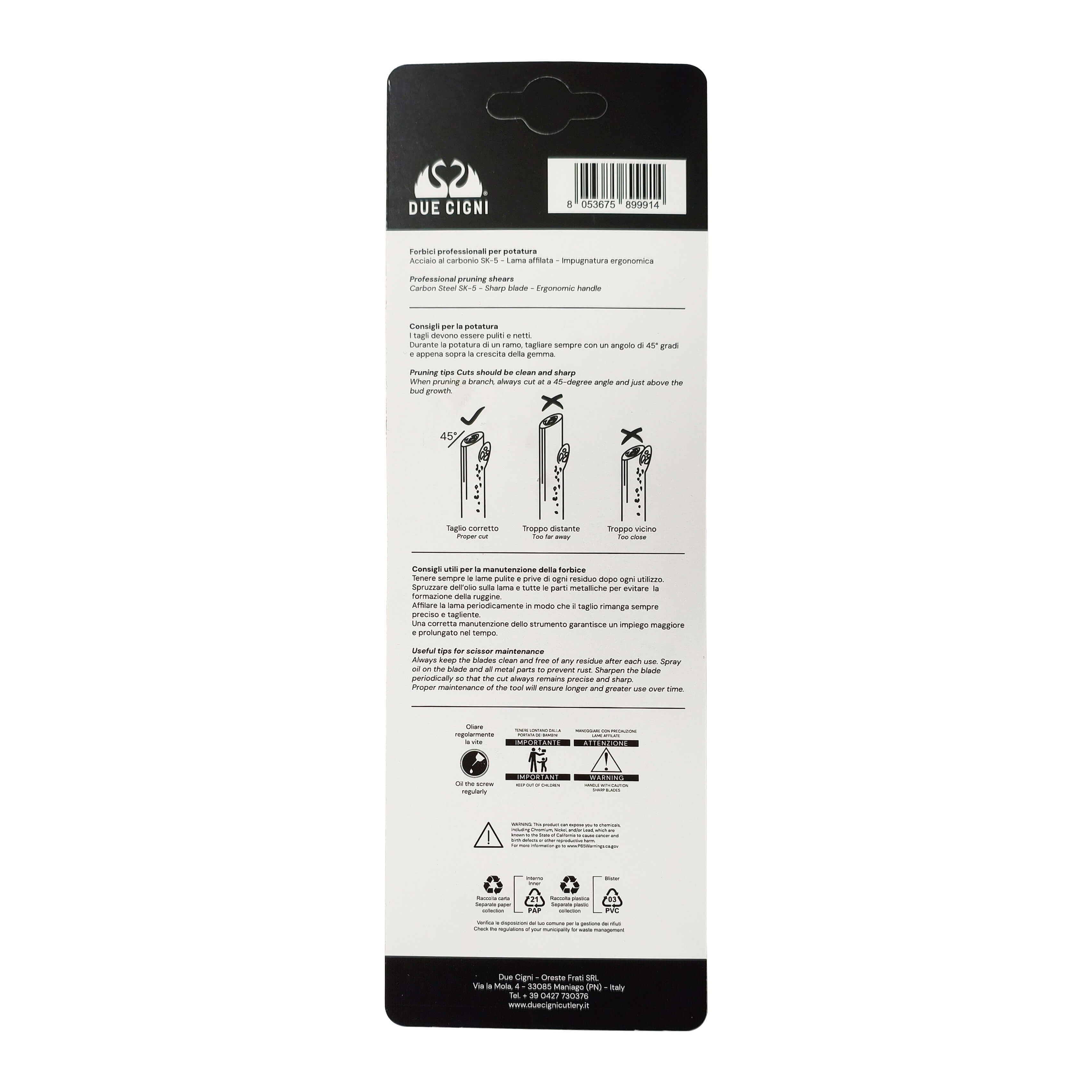 Foarfeca profesională DUE CIGNI 2C 380/20 este proiectată integral de FOX Knives Italia, un nume consacrat în producția de unelte de tăiere de înaltă calitate. Această foarfecă este destinată în special pomicultorilor și viticultorilor care au nevoie de un instrument fiabil, robust și precis pentru lucrările de întreținere a pomilor fructiferi.