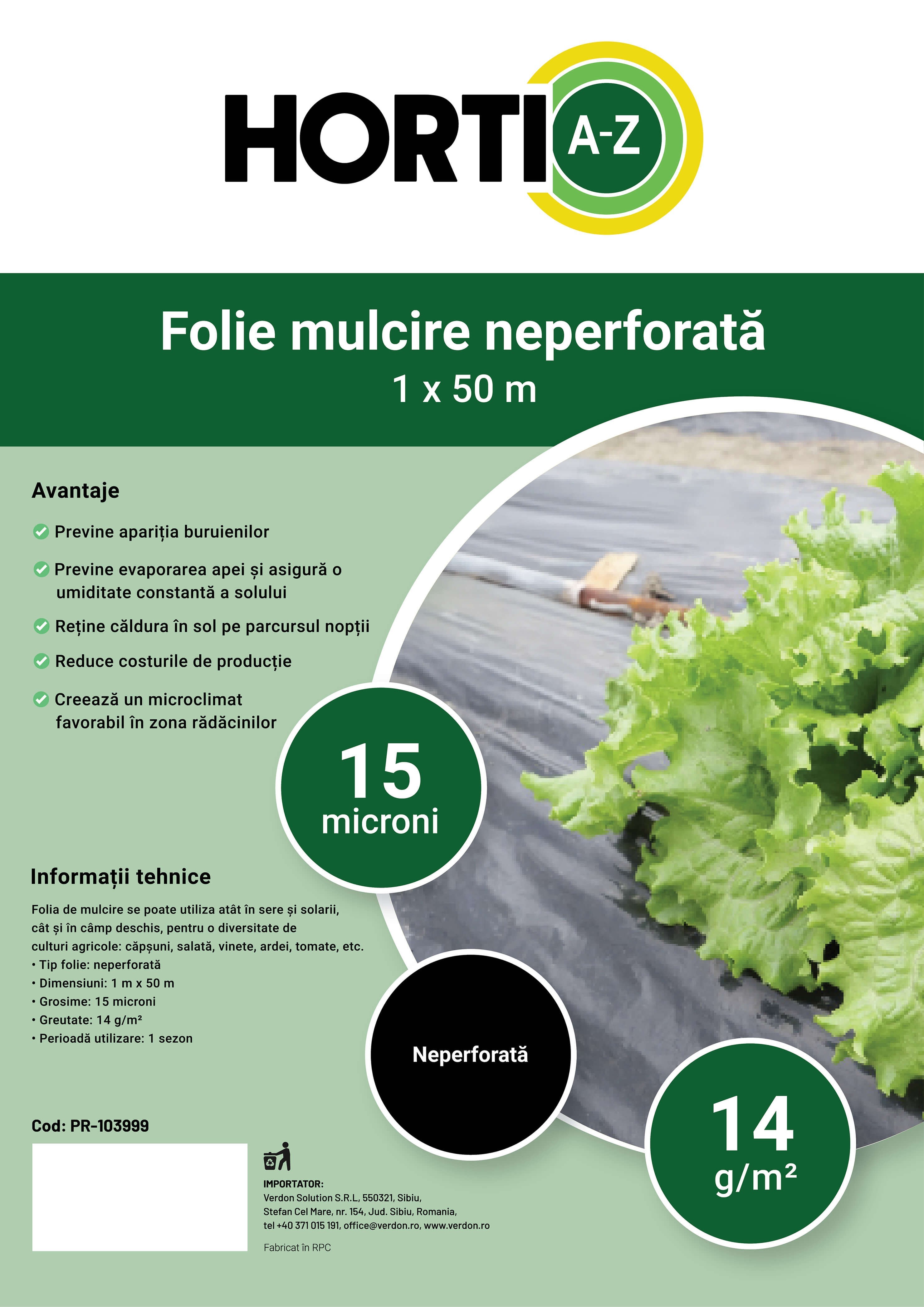 Folie mulcire HORTI A-Z, Neagra, Neperforata, 15 microni - rola 1 x 50 m