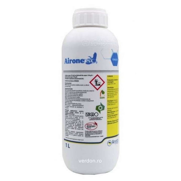 Airone SC, fungicid de contact pe baza de cupru, folosit pentru o gama larga de culturi horticole, cartof, hamei si plante ornamentale. Are o formulare speciala, care combina doua forme de cupru: hidroxid care are o actiune rapida si oxiclorura, cu o activitate de lunga durata.