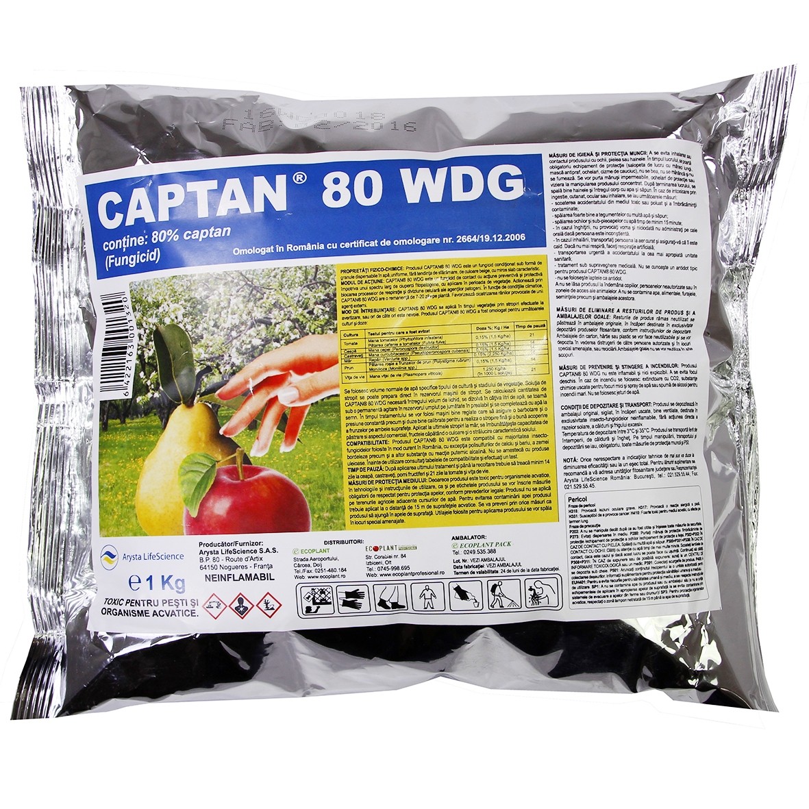 Captan 80 WDG este un fungicid de contact care actioneaza prin blocarea proceselor de respiratie si diviziune celulara ale agentilor patogeni. In functie de conditiile climatice, Captan 80 WDG are o remanenta de 7-20 zile pe planta. Favorizeaza cicatrizarea ranilor provocate de unii agenti externi.