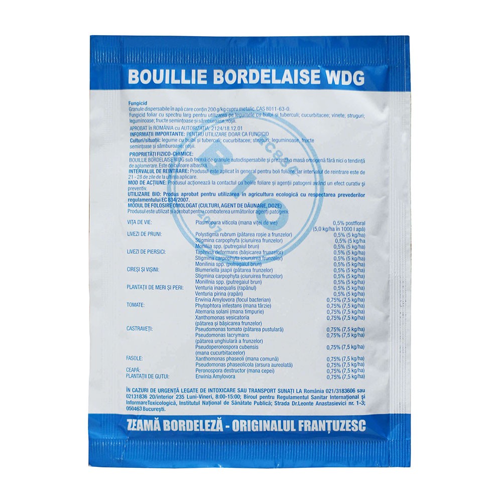 Zeama bordeleza (Bouille Bordelaise WDG), fungicid de contact, pe baza de cupru, care controleaza mai multe boli cauzate de ciuperci si bacterii: alternarioza, rapan, foc bacterian, ciuruire, patare unghiulara etc.