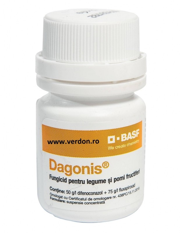 Fungicid DAGONIS, fungicid polivalent, usor de folosit si care se poate aplica la peste 20 de culturi: pomi fructiferi (mar, par) si legume (tomate, castraveti, mazare, morcov, salata, varza, capsun, vinete, ardei, etc).