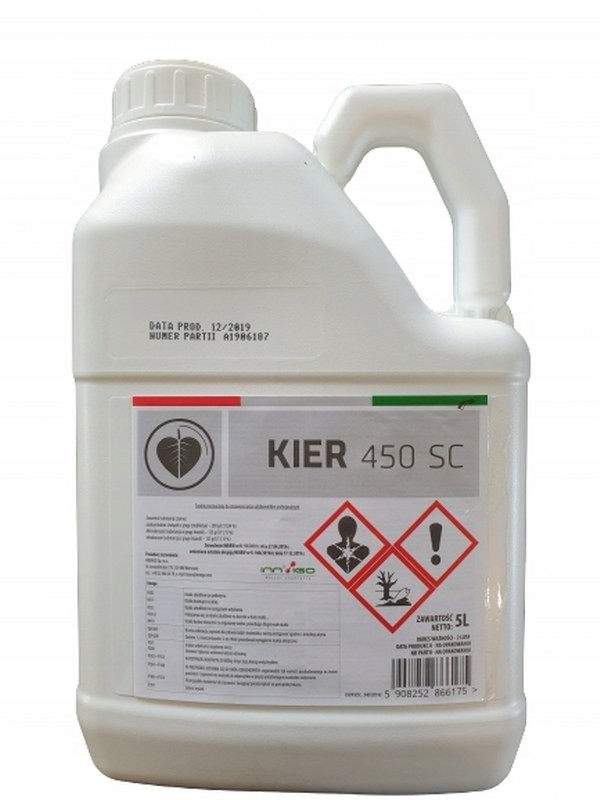 KIER 450 SC, este un fungicid, conditionat sub formă de suspensie concentrată (SC), de culoare albă, omogenă, cu efect sistemic, pentru utilizare preventivă și curativă împotriva bolilor fungice.