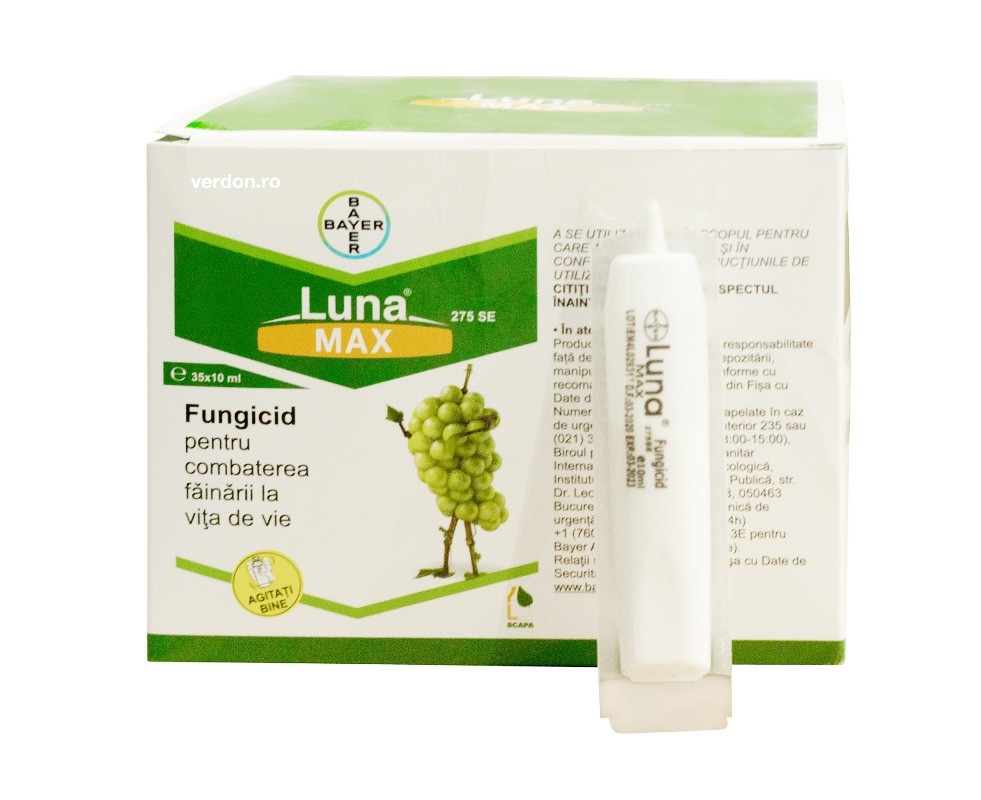 Luna Max 275 SE este omologat in pentru combaterea fainarii (Uncinula necator sinonim Erysiphe necator) la cultura vitei de vie, in doza de 1 L/ha. Se aplica preventiv, la avertizare, sau cand sunt conditii favorabile pentru dezvoltarea patogenului, in numar de 2 tratamente pe sezon, la un interval de 10-12 zile. Perioada de aplicare: de la inflorescente clar vizibile (BBCH 53) pana la inceputul coacerii (BBCH 81).