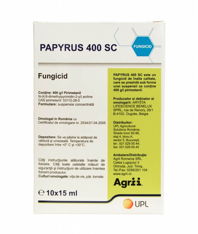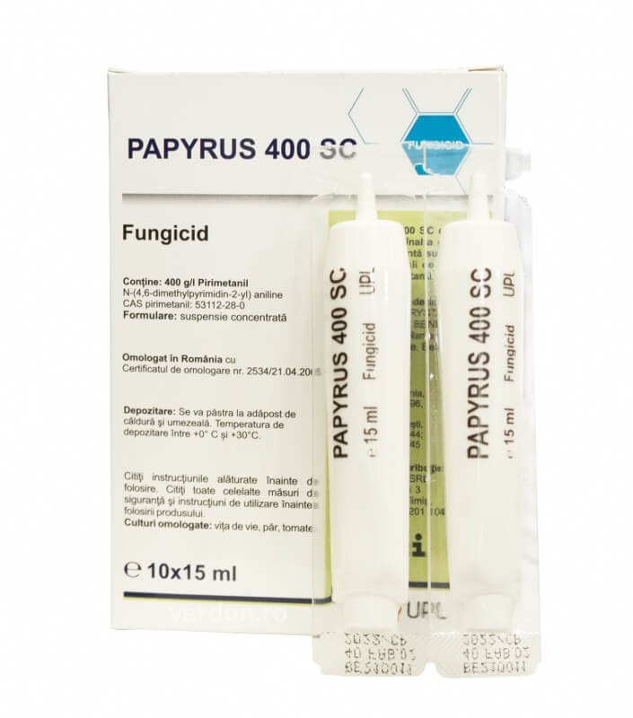 Papyrus 400 SC (Pyrus 400 SC), fungicid de contact folosit pentru combaterea putregaiului cenusiu din culturile de vita de vie, pomi, legume si plante ornamentale.