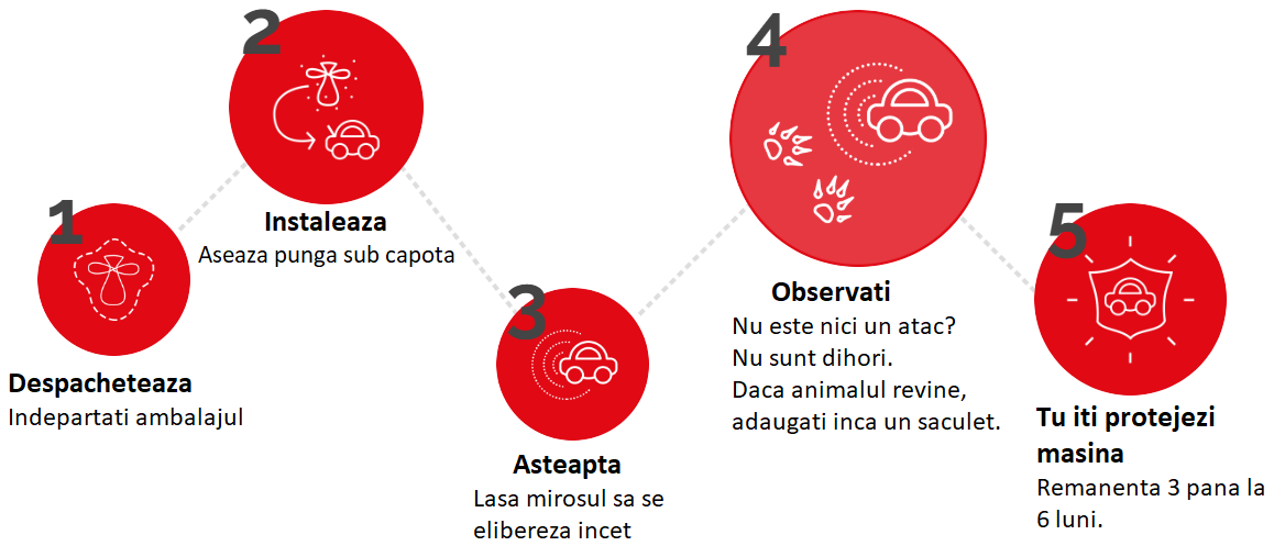 Protectie demonstrata impotriva dihorilor. Eficienta a fost confirmata pe perioada testelor care au durat 12 luni. Testele s-au desfasurat in gospodarii in care dihorii au provocat pagube materiale in mansarde si sub capota masinilor. Metoda de operare si compozitie a fost brevetata.