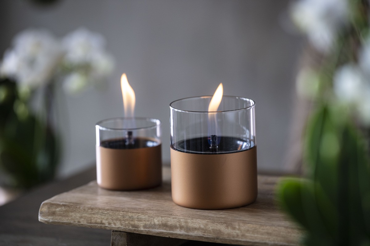 Lumânarea ambientală TenderFlame Lilly 10 Copper Glass ce asigură o flacără constantă și curată, oferind o ambianță deopotrivă liniștitoare și sigură datorită combustibilului Tenderfuel nepoluant ce funcționează doar în combinație cu fitilul din oțel inoxidabil.