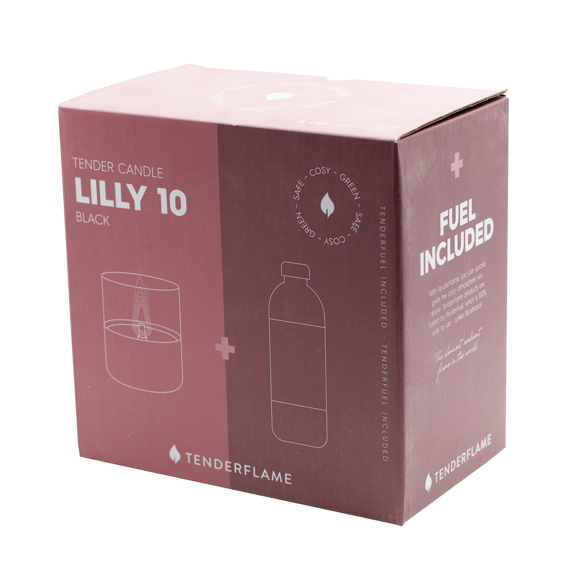Lumânarea ambientală TenderFlame Lilly 10 Black Glass ce asigură o flacără constantă și curată, oferind o ambianță deopotrivă liniștitoare și sigură datorită combustibilului Tenderfuel nepoluant ce funcționează doar în combinație cu fitilul din oțel inoxidabil.