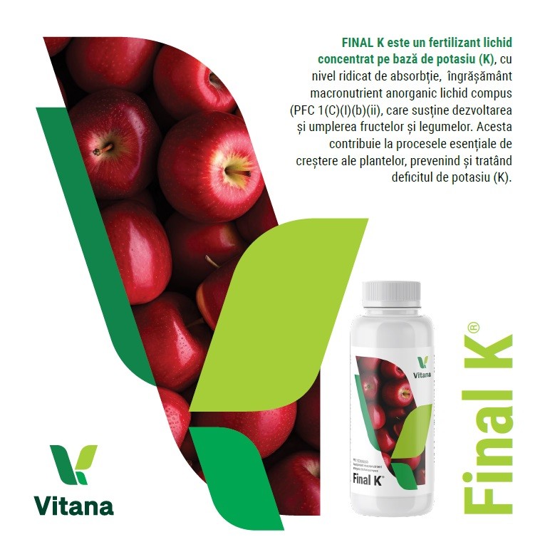 FINAL K® este un fertilizant lichid concentrat, pe bază de potasiu (K), cu nivel ridicat de absorție, îngrășământ macronutrient anorganic lichid compus (PFC 1(C)(I)(b)(ii), care susține dezvoltarea și umplerea fructelor și legumelor.