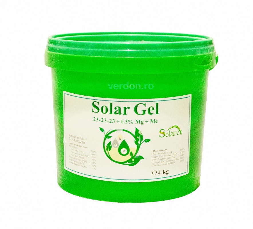 Solar Gel 23-23-23 + 1, 3% Mg + ME, ingrasamant sub forma de gel cu continut echilibrat de macro si microelemente, absorbit si asimilat rapid cu efect puternic de stimulare a fotosintezei ce duce la cresteri vegetative viguroase si fructificare abundenta.