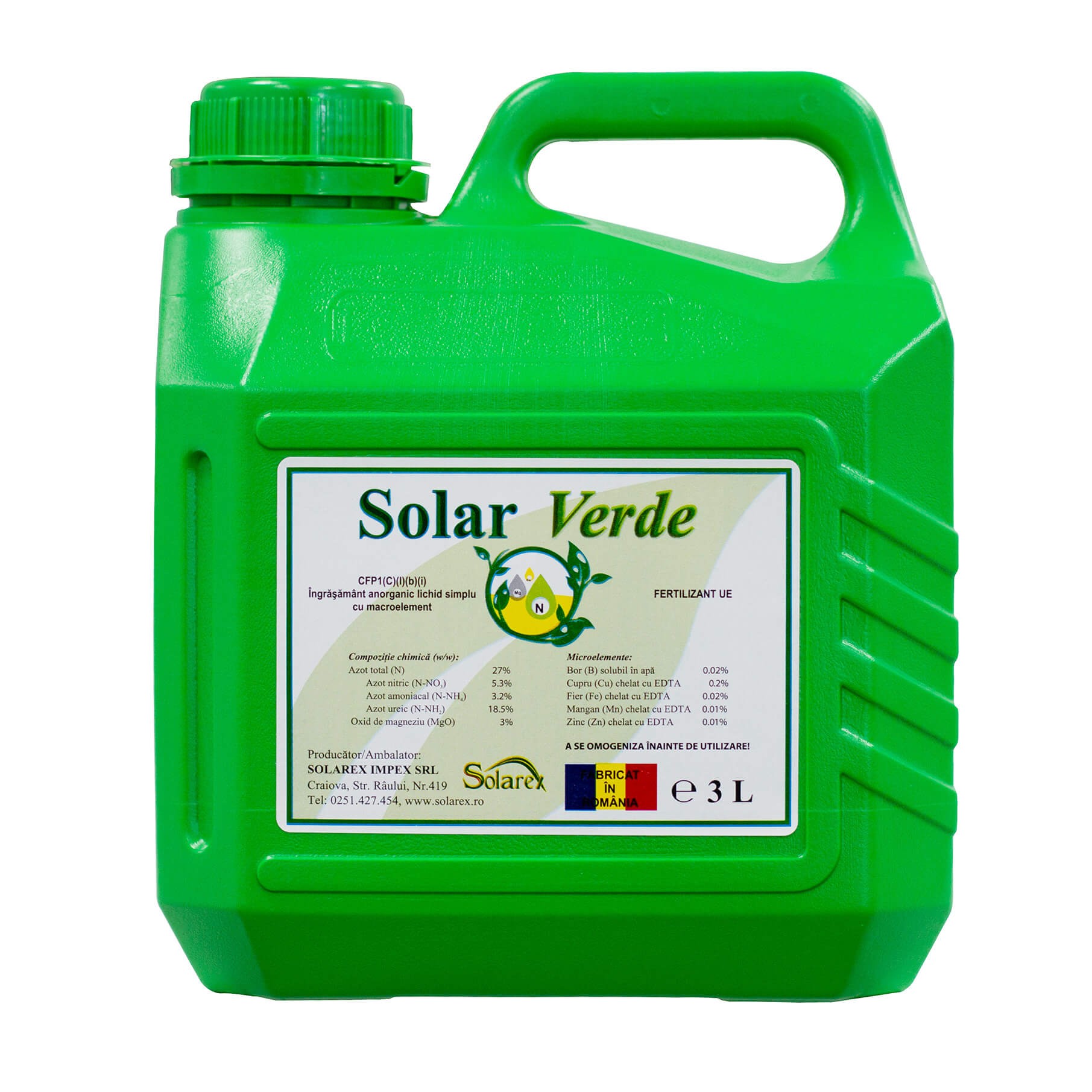 Solar Verde, ingrasamant foliar lichid care contine o cantitate mare de N, Mg, Cu si microelemente chelatate EDTA, destinat fertilizarii tuturor culturilor agricole.
