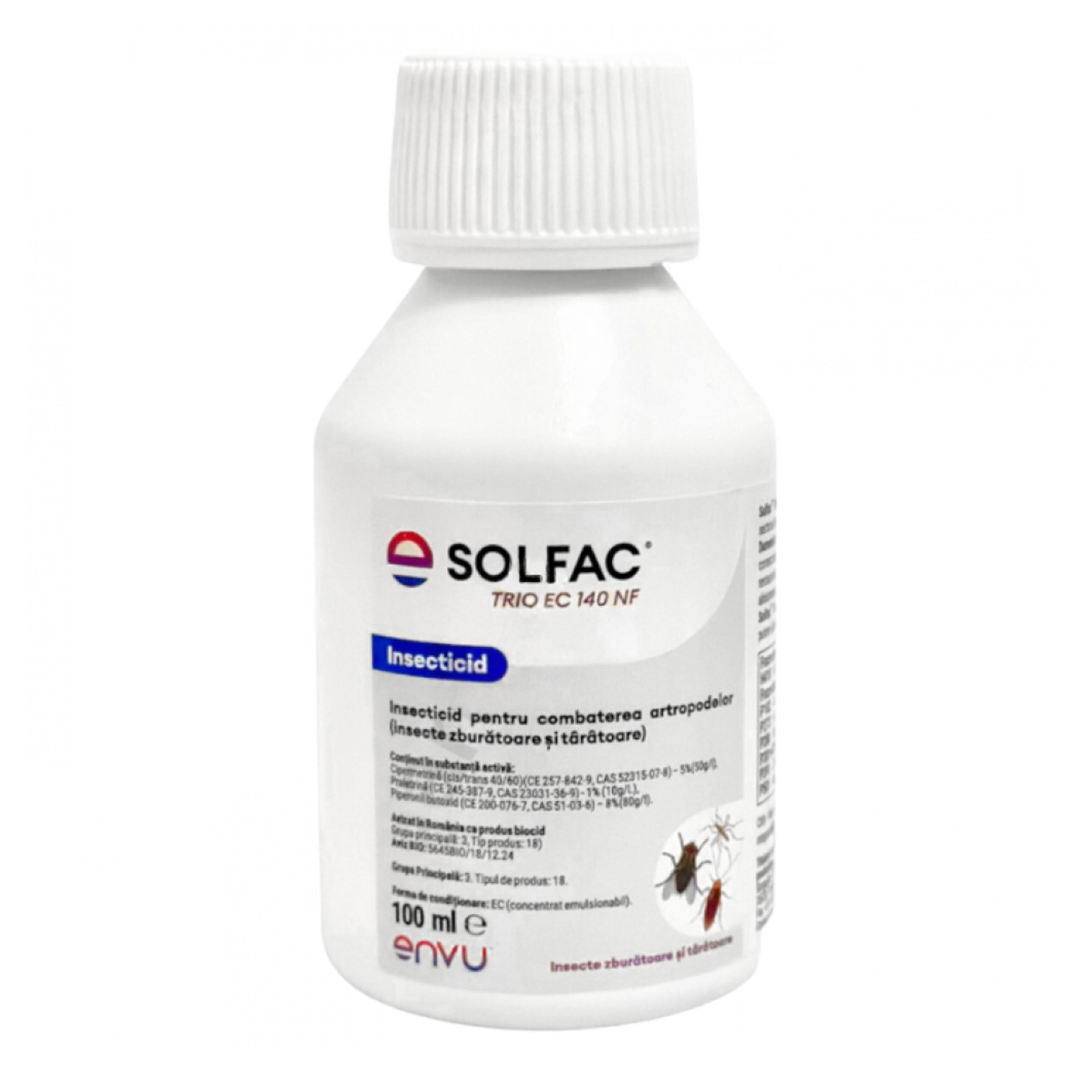 Solfac Trio EC 140, insecticid concentrat emulsionabil, cu 3 substanțe active, cu eficiență ridicată împotriva Muștelor, Țânțarilor, Gândacilor și a altor insecte zburătoare sau târâtoare.