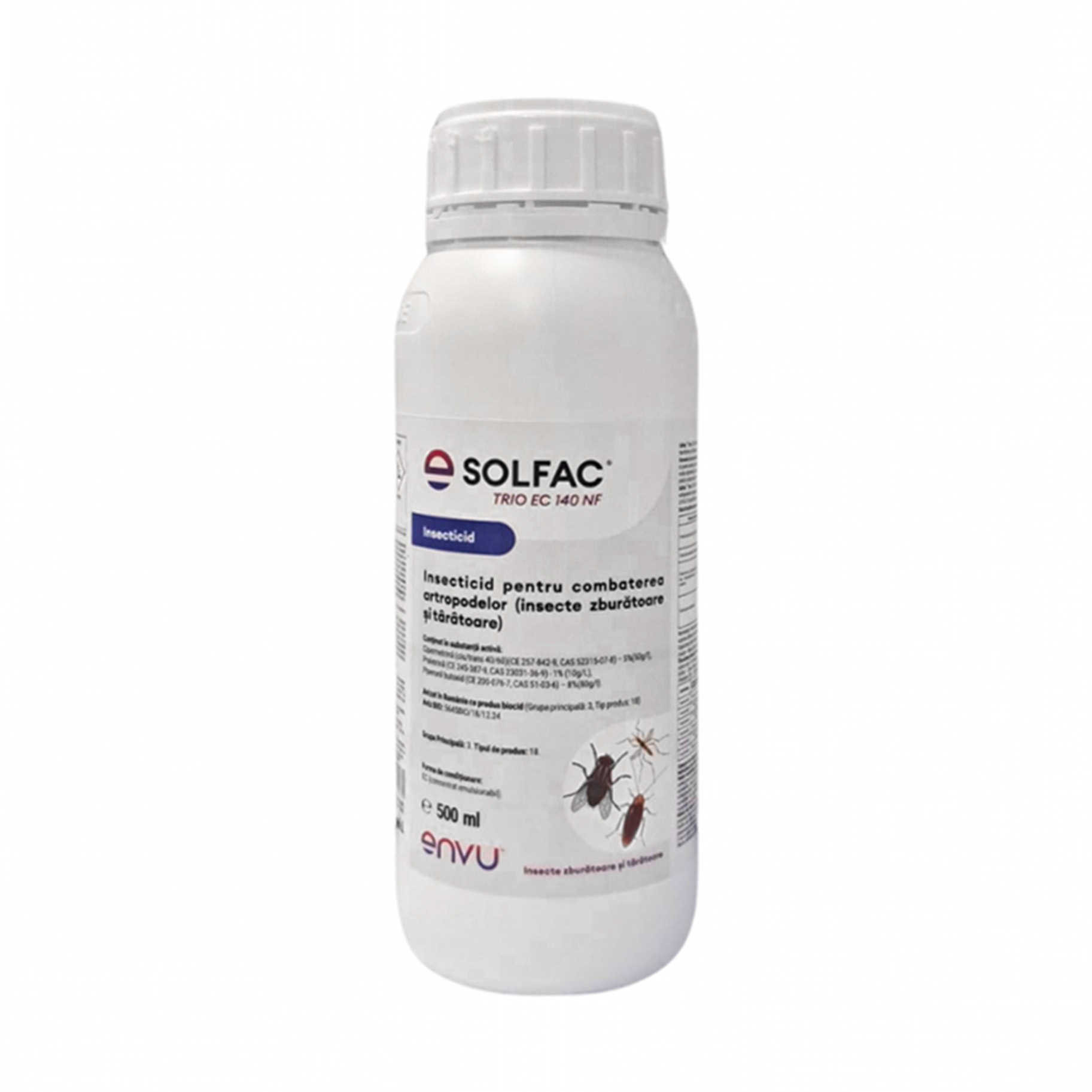Solfac Trio EC 140, insecticid concentrat emulsionabil, cu 3 substanțe active, cu eficiență ridicată împotriva Muștelor, Țânțarilor, Gândacilor și a altor insecte zburătoare sau târâtoare.