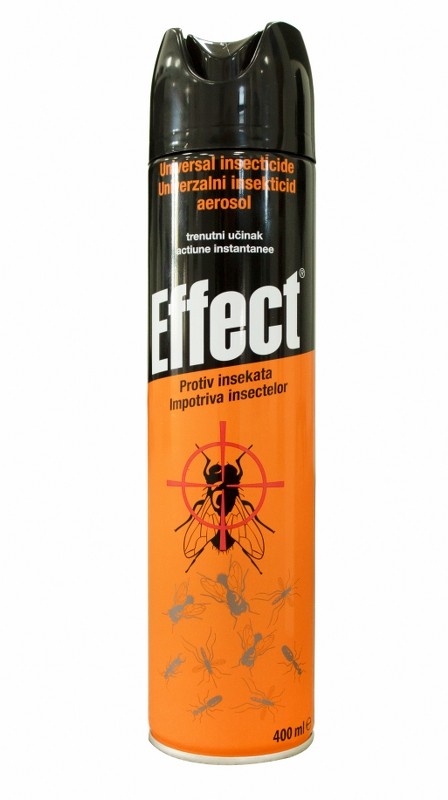 Insecticidul universal Effect aerosol contine doua ingrediente active: permetrina si tetrametrina, care asigura o protectie instantanee si de lunga durata a spatiilor interioare si exterioare impotriva mustelor si tantarilor. Este deasemenea foarte eficient impotriva moliilor, acarienilor, furnicilor, pesti argintii, paduchi etc.