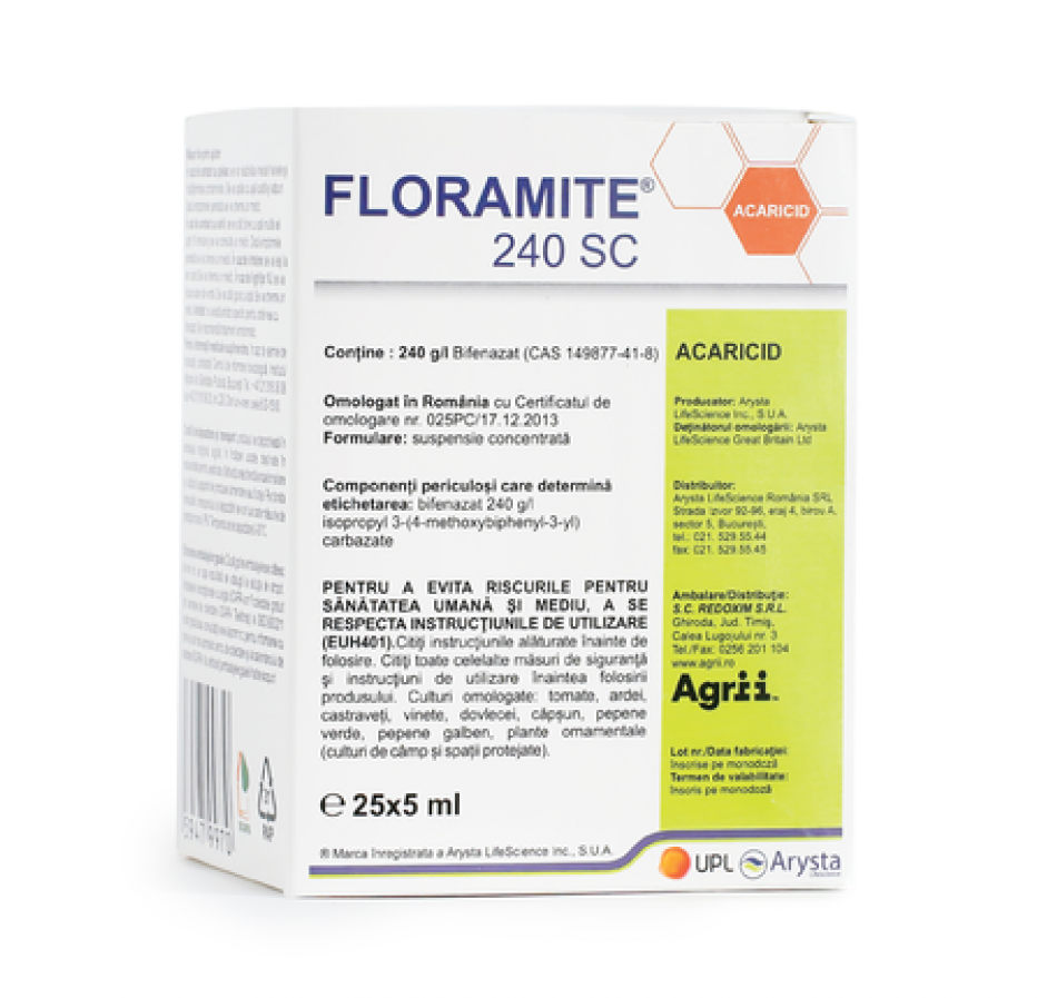 Floramite 240 SC este un acaricid, selectiv de ultimă generație pe bază de bifenazat, pentru controlul speciilor de acarieni din culturile agricole. Floramite 240 SC are acțiune de contact. La 3 ore după aplicare acarienii încetează să se mai hrănească, iar efectul letal se instalează în decurs de 4 zile, urmând o lungă activitate reziduală asupra dăunătorilor.