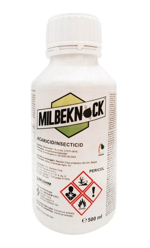 Milbeknock EC este un insecto-acaricid pe bază de milbemectin, utilizat in culturile horticole, combătând un spectru larg de acarieni și microlepidoptere Tetranychus urticae, Phyllonorichter blancardella, Panonychus ulmi. Este produs pe baza unei substanţe naturale obţinută din bacteria Streptomyces hygroscopicus subsp. Aureolacrimosus, fiind o substanţă dintr-o sursă naturală.