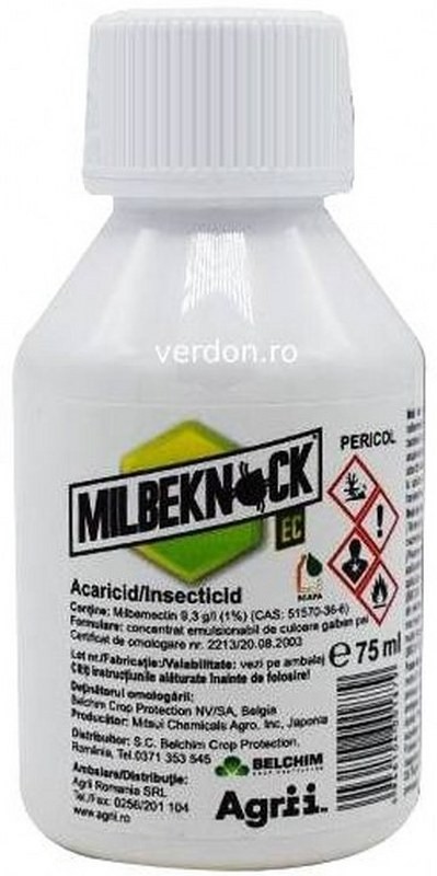 Milbeknock EC este un insecto-acaricid pe bază de milbemectin, utilizat in culturile horticole, combătând un spectru larg de acarieni și microlepidoptere Tetranychus urticae, Phyllonorichter blancardella, Panonychus ulmi. Este produs pe baza unei substanţe naturale obţinută din bacteria Streptomyces hygroscopicus subsp. Aureolacrimosus, fiind o substanţă dintr-o sursă naturală.