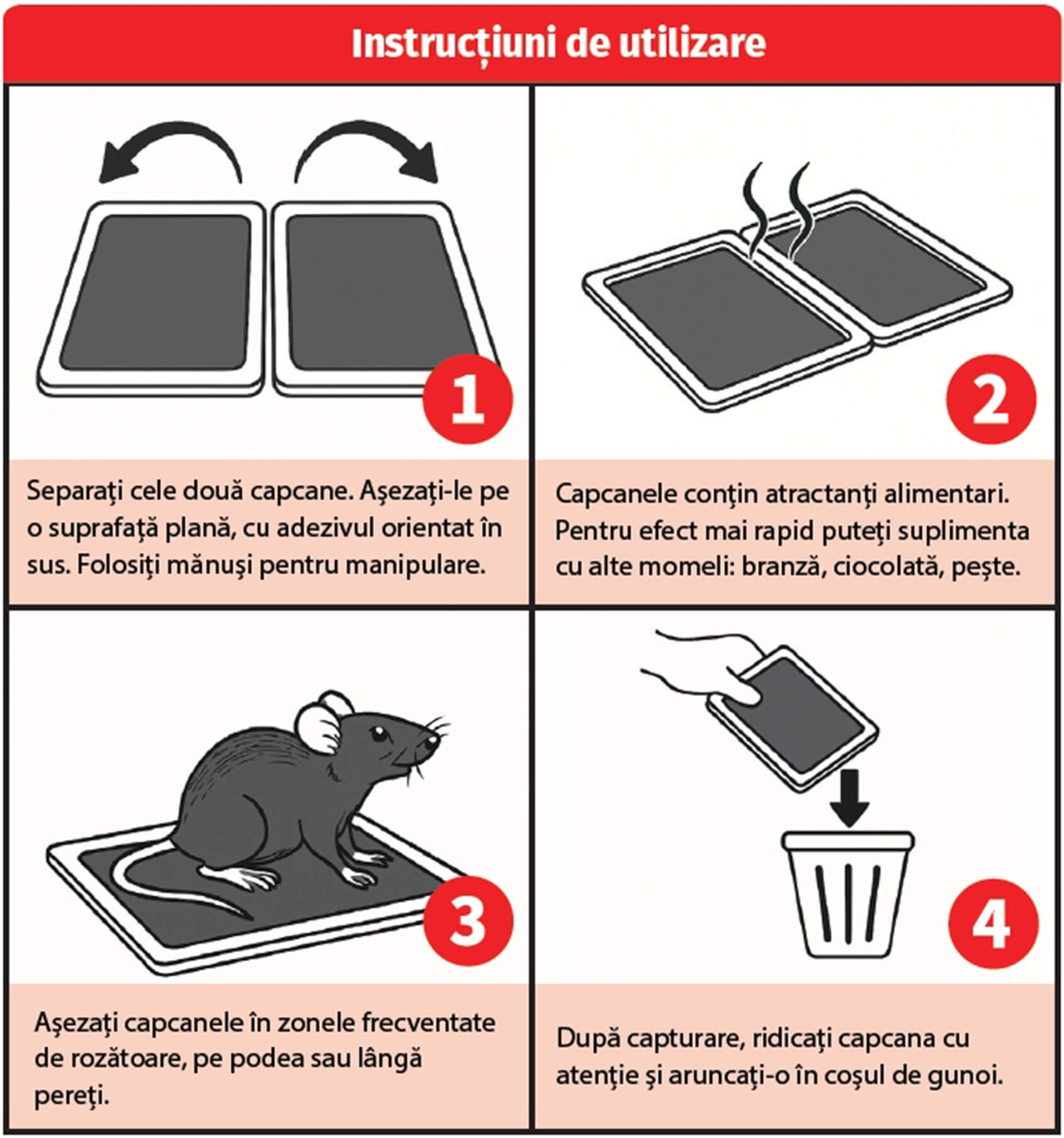 Capcana adezivă este ideală pentru capturarea rozătoarelor în zone greu accesibile și pentru prevenirea mirosurilor neplăcute asociate combaterii cu raticide.