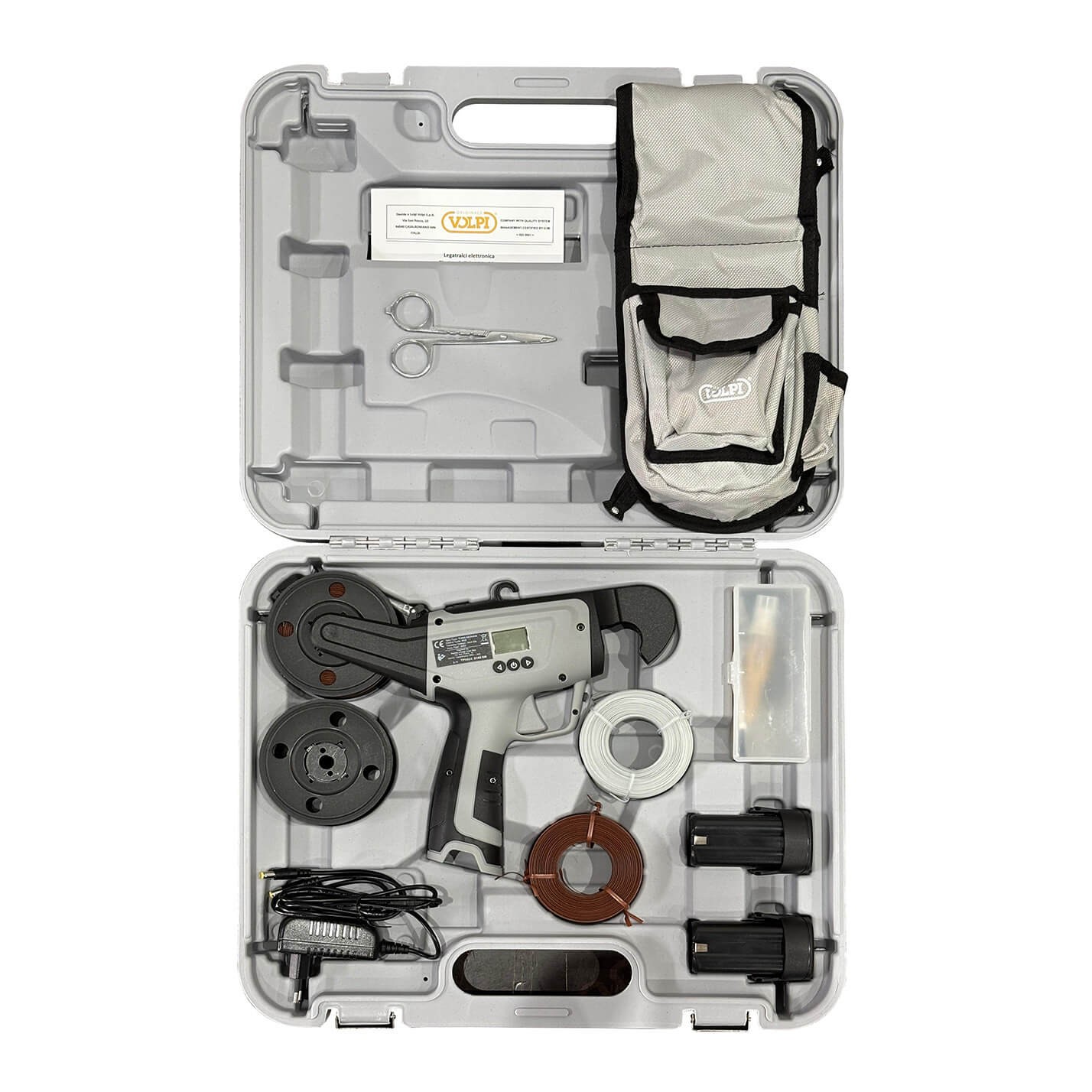 Aparat de legat cu acumulatori Volpi KV5, ușor și practic, ideal pentru lucrările în agricultură, viticultură și grădinărit.