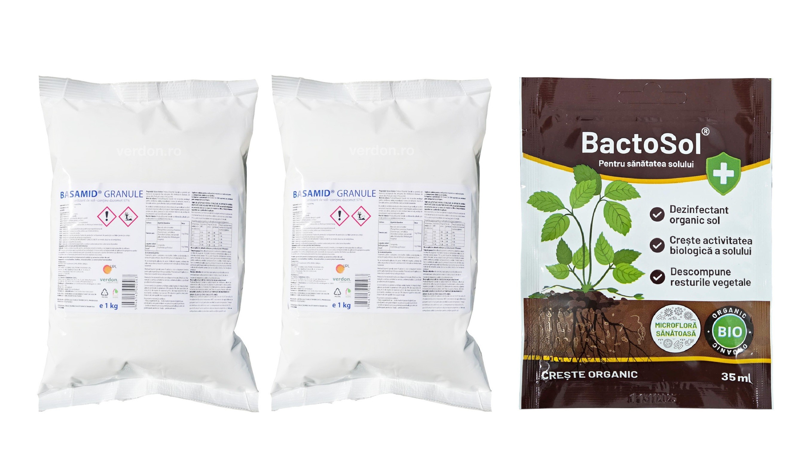 • 2 x BASAMID Granule 1 kg – nematocid și dezinfectant pentru sol, cu acțiune complexă împotriva nematozilor, bolilor, dăunătorilor și semințelor de buruieni. Produsul acționează prin eliberarea unui gaz sterilizant în sol, eliminând rezervele de patogeni și reducând presiunea de infecție. Avantajul major este eficiența ridicată, însă fiind un sterilizant total, afectează și microorganismele benefice.
