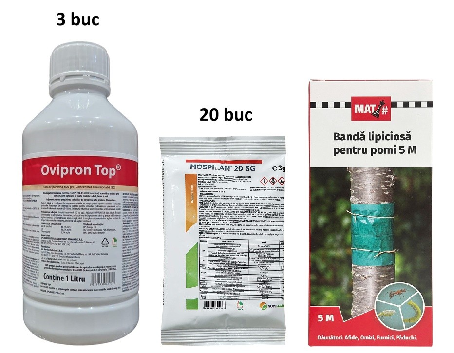 Pachet SMART-MIX 232 - OVIPRON TOP (3 Litri) + MOSPILAN 20 SG (20 x 3 g) + Banda lipicioasa pomi MAT (5 m)