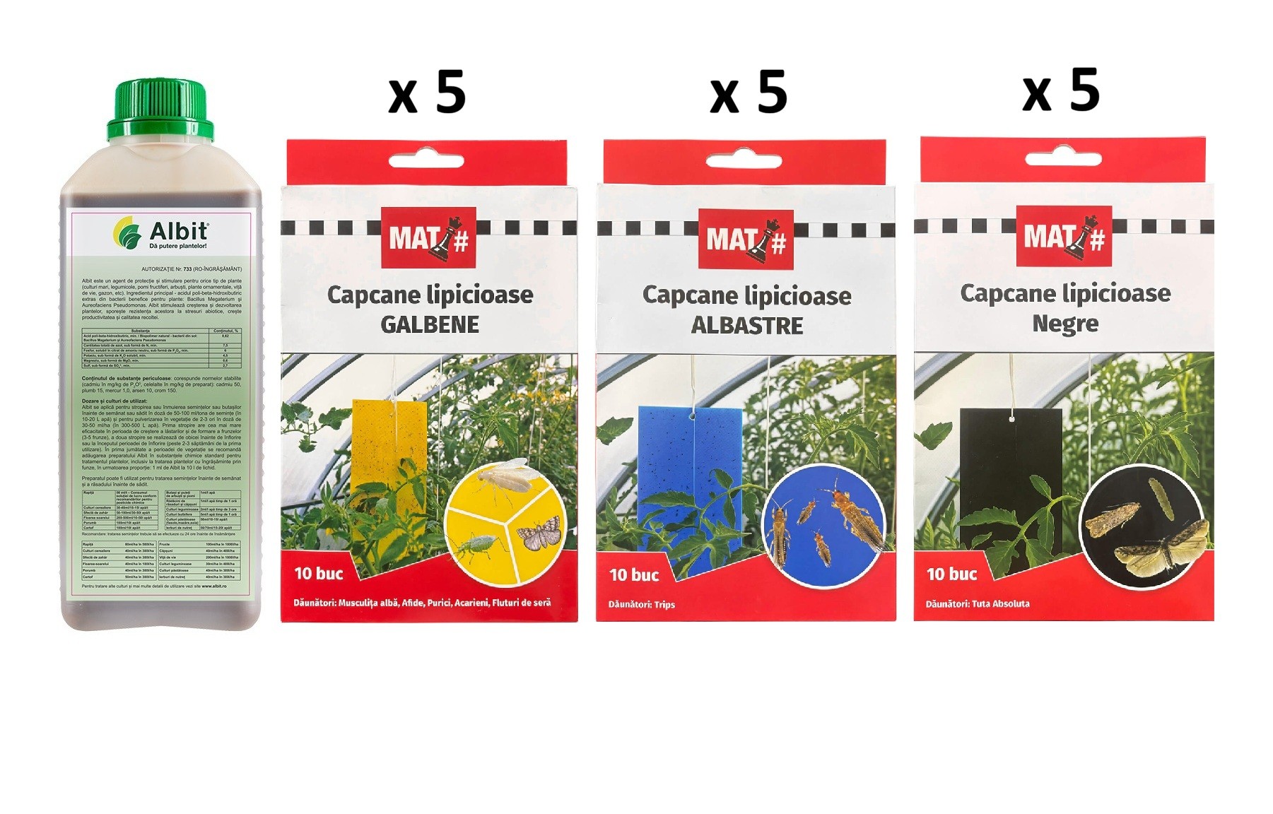 Pachet SMART-MIX 236 - Biostimulator Albit 1 L + Capcane lipicioase MAT, Galbene (5 buc), Albastre (5 buc), Negre (5 buc)