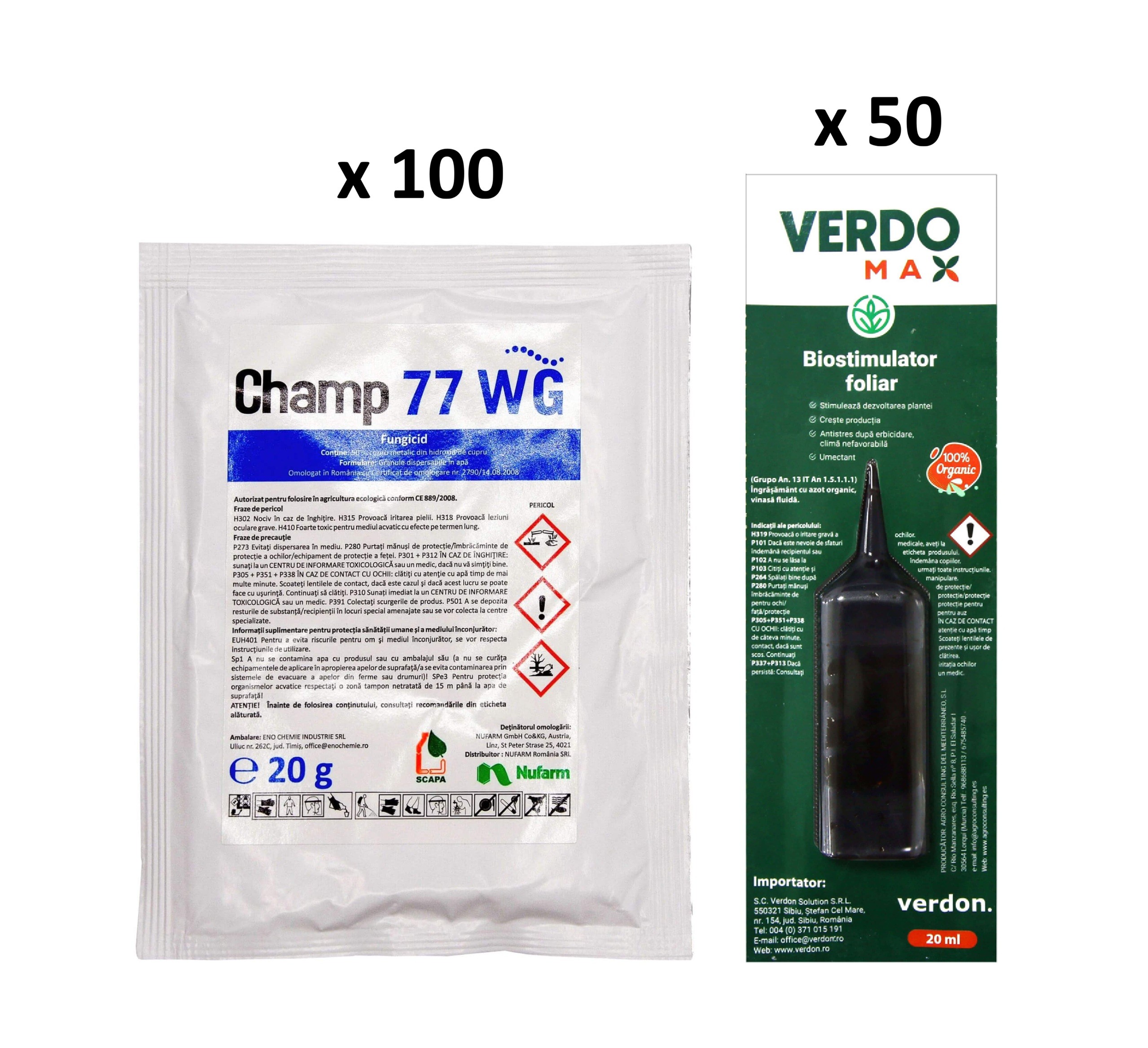 Pachet SMART-MIX 271 - Fungicid CHAMP 77 WG, Nufarm, 20 g (x 100 buc) + Biostimulator VERDOMAX 20 ml (x 50 buc)