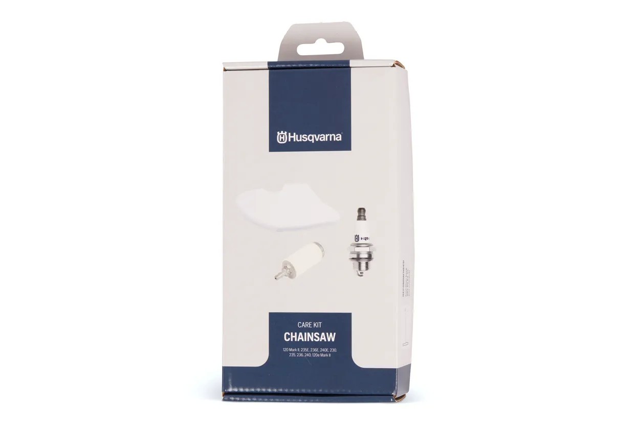 Kit de întreținere Husqvarna pentru motoferăstrău, include bujie, filtru de aer și filtru de combustibil.