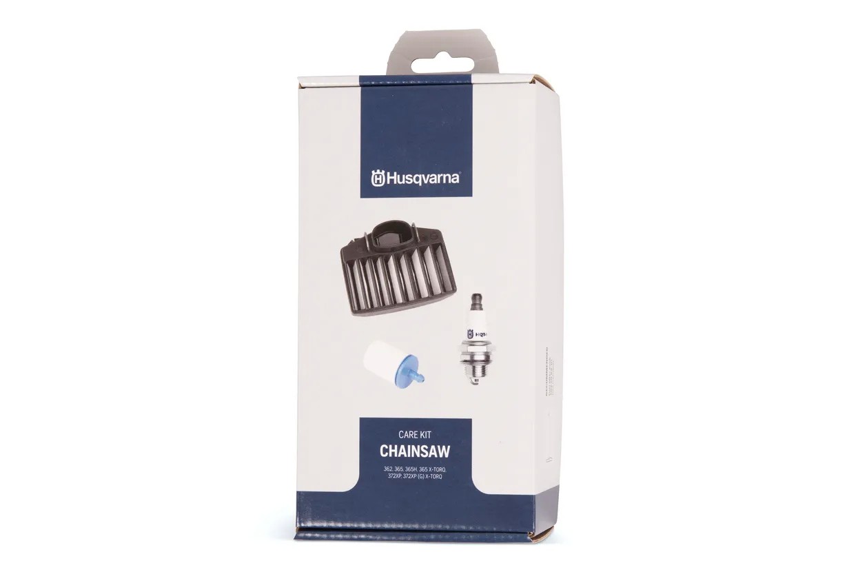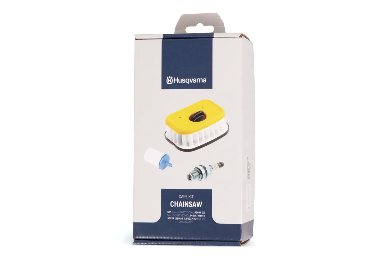 Kit de întreținere Husqvarna pentru motoferăstrău, include bujie, filtru de aer și filtru de combustibil.