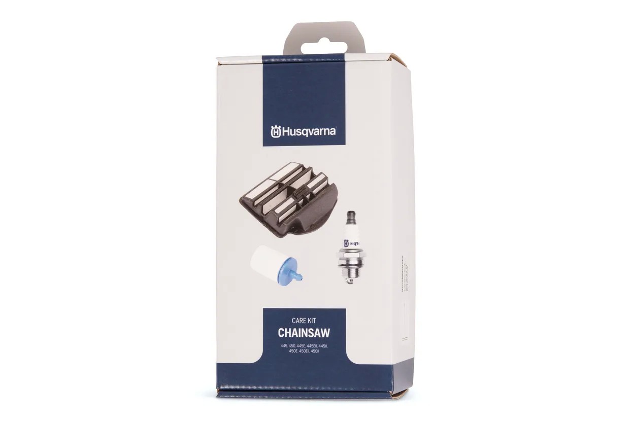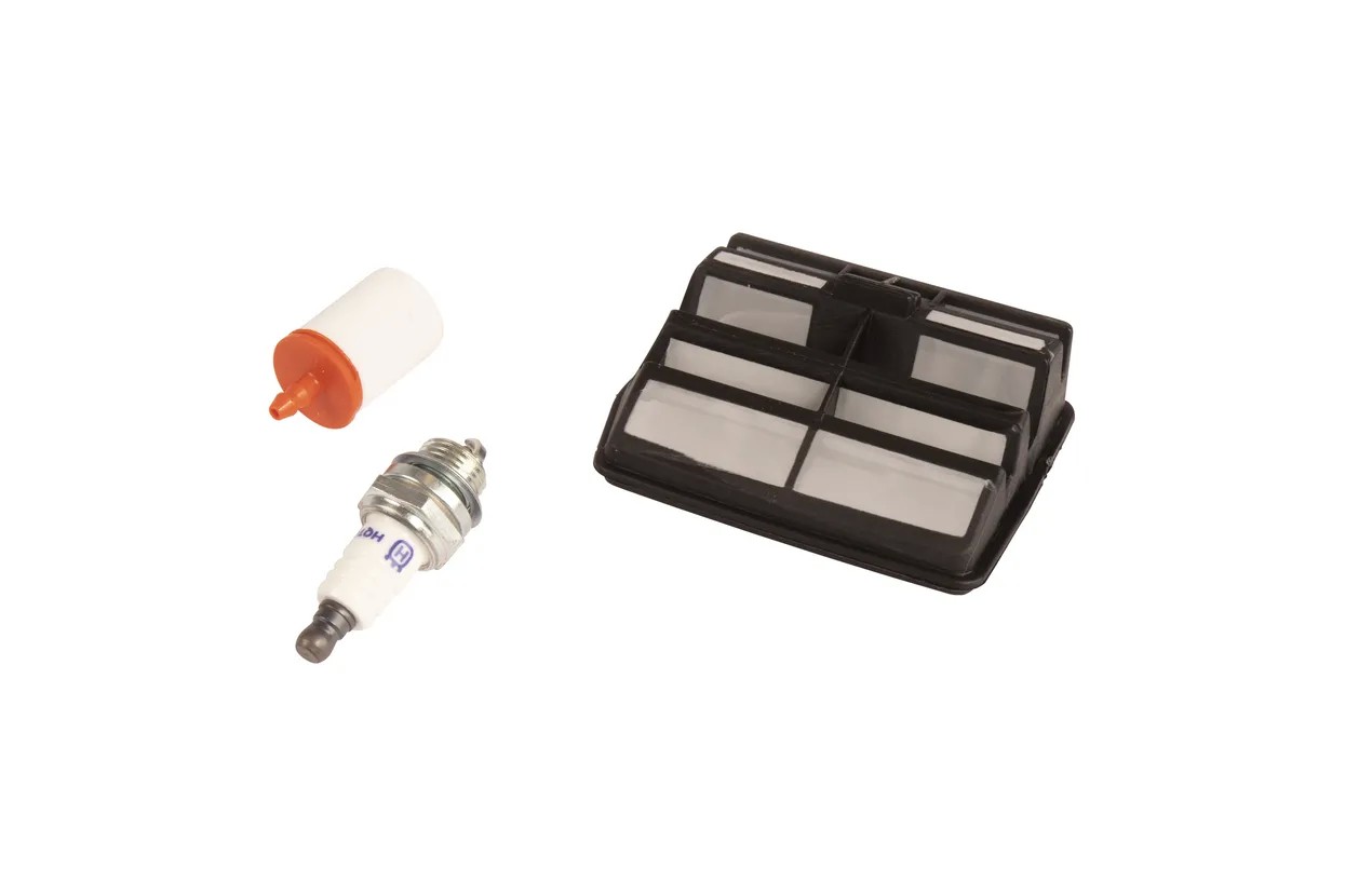 Kit de întreținere Husqvarna pentru motoferăstrău, include bujie, filtru de aer și filtru de combustibil.