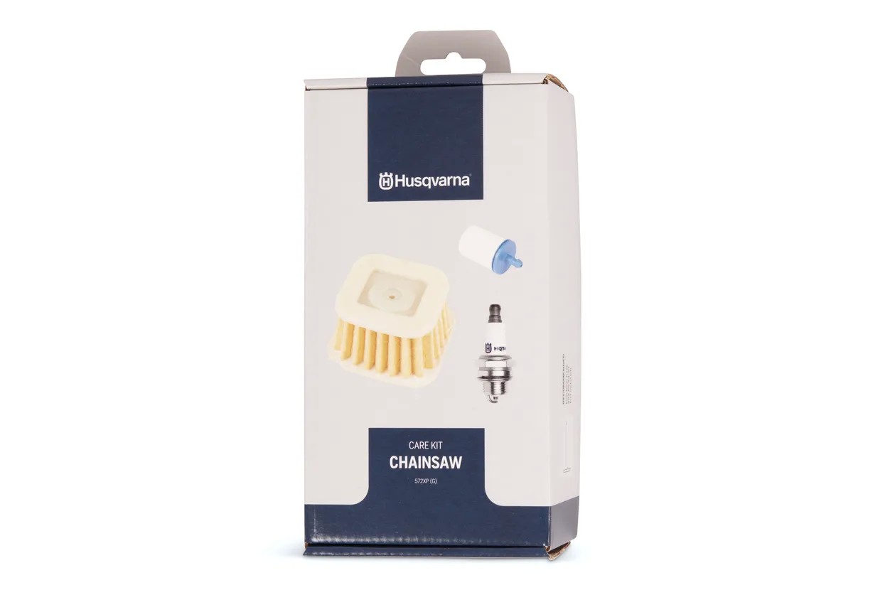 Kit de întreținere Husqvarna pentru motoferăstrău, include bujie, filtru de aer și filtru de combustibil.