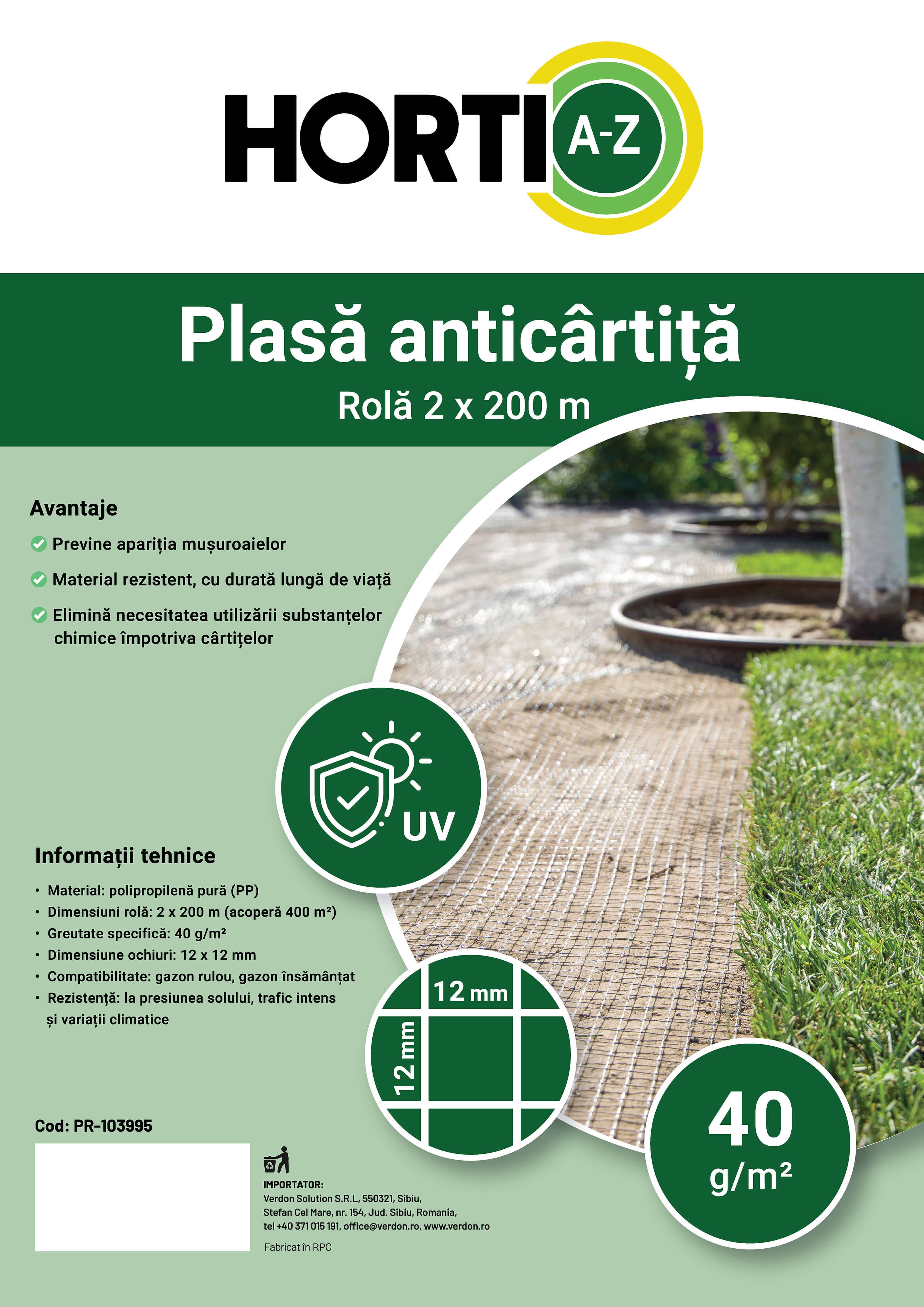 Plasa anticârtiță HORTI A-Z este o barieră mecanică durabilă, creată pentru a proteja gazonul, grădinile și terenurile agricole împotriva cârtițelor și rozătoarelor. Realizată din polipropilenă extrudată (PP) cu densitate de 40 g/m², plasa oferă rezistență ridicată și o suprafață generoasă de acoperire, fiind recomandată pentru proiecte de anvergură, atât în mediul rezidențial, cât și în aplicații profesionale de peisagistică și agricultură.