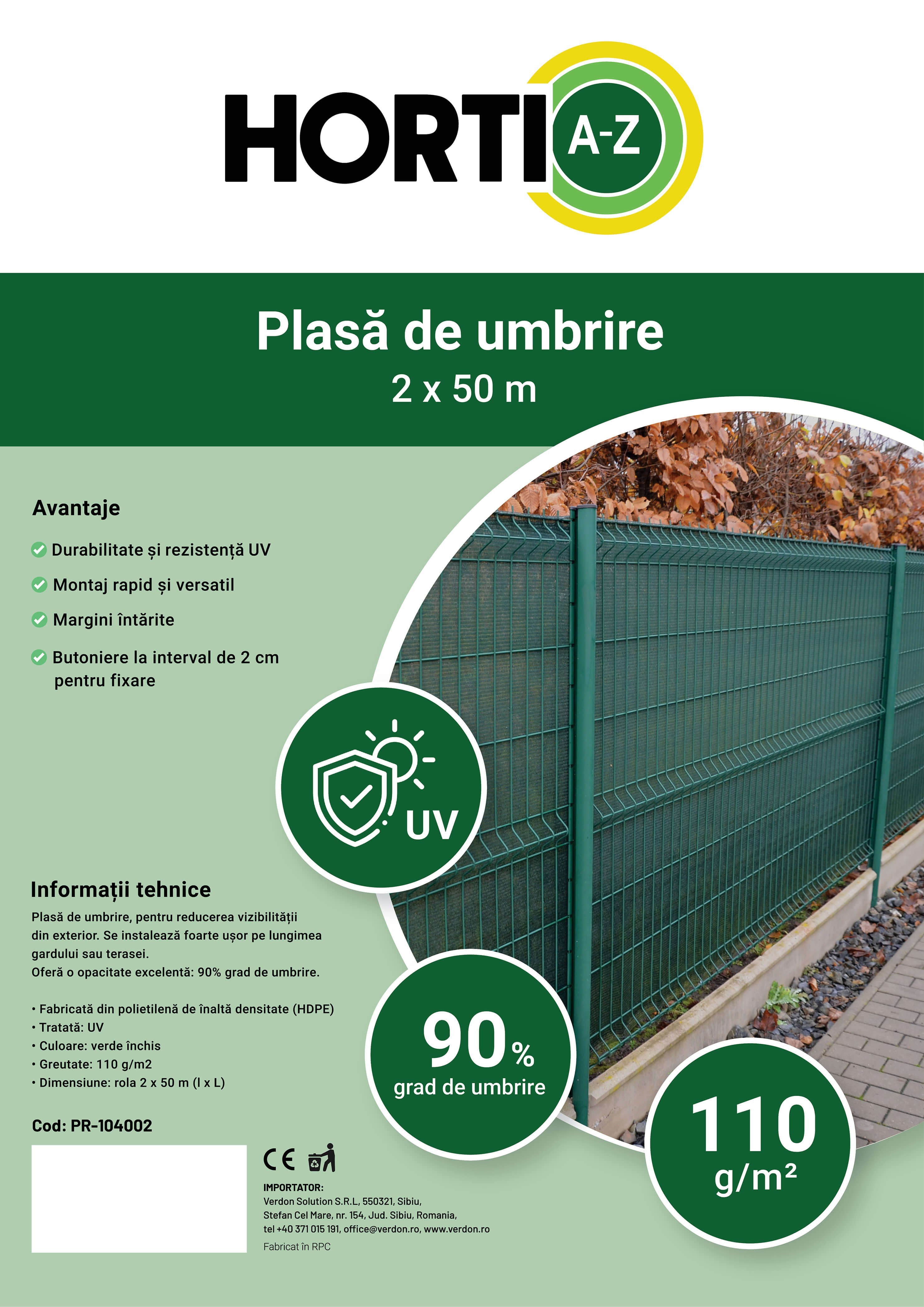 Plasa de umbrire gard HORTI A-Z, verde inchis, 110 gm2, grad umbrire 90% - rola 2 x 50 m
