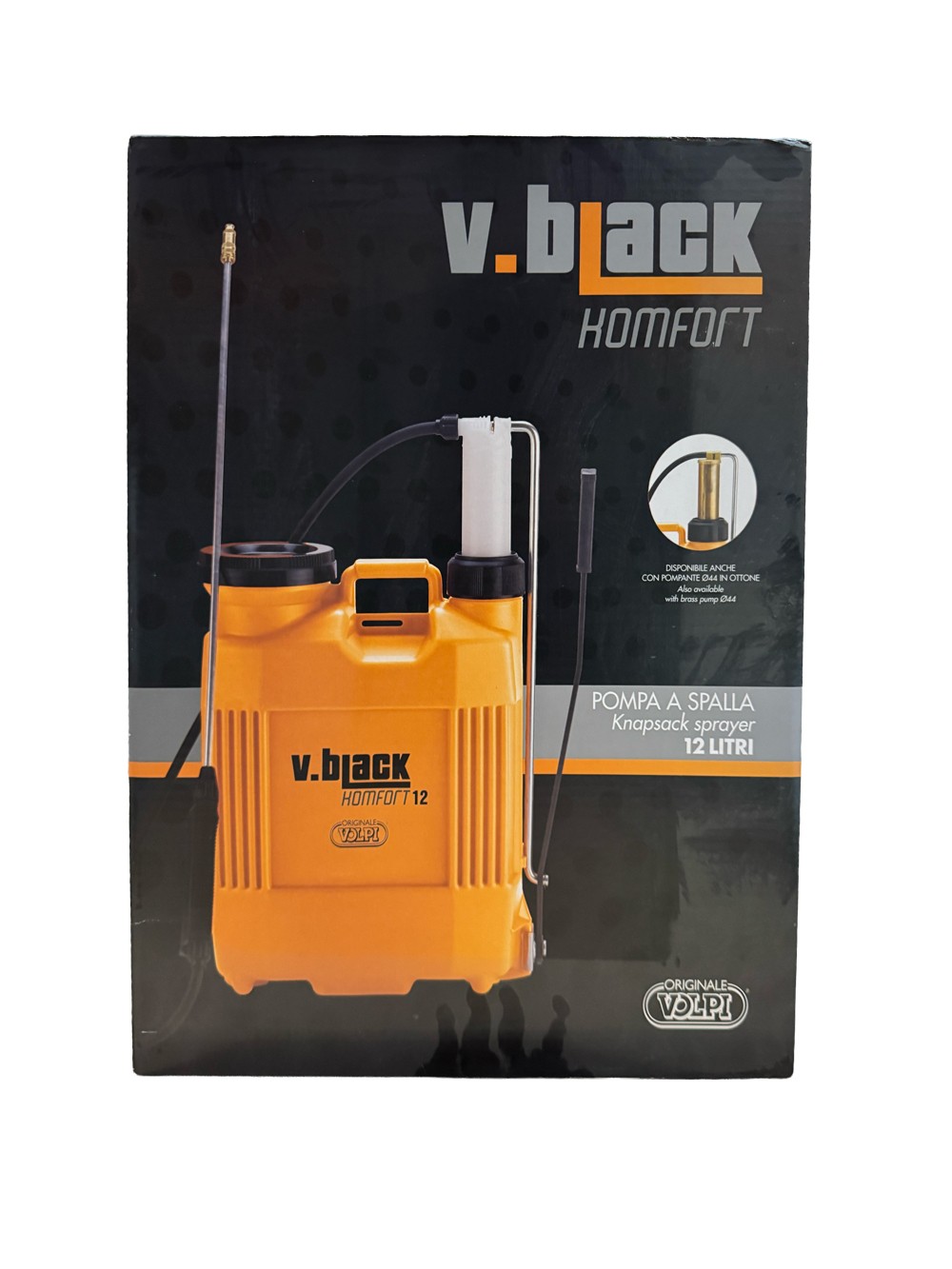 V-BLACK KOMFORT, pompă manuală de presiune, purtată pe umăr, cu o capacitate de 12 litri. Ușoară dar robustă și fiabilă, ușor de întreținut, ca toate produsele marca Volpi. Destinat utilizării în agricultură și în grădină. Sistemul de pompare testat favorizează o acțiune confortabilă asupra pârghiei fără a obosi operatorul.