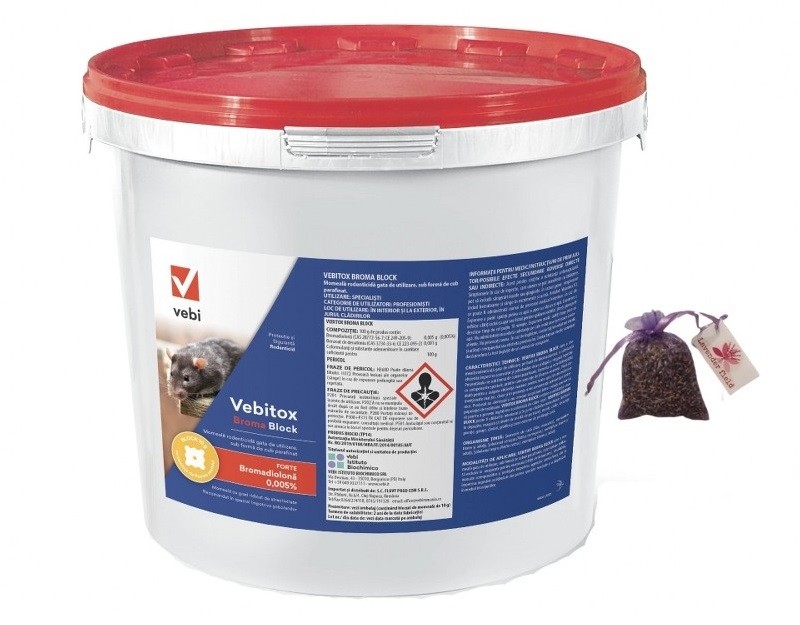Vebitox Broma Block este o momeală rodenticidă gata de utilizare, bazată pe o substanță anticoagulantă, cunoscută sub numele de bromadiolonă, eficientă împotriva șoarecilor de casă (Mus musculus), șobolanului gri (Rattus norvegicus) și șobolanului negru (Rattus Rattus), chiar și după o singură ingestie.