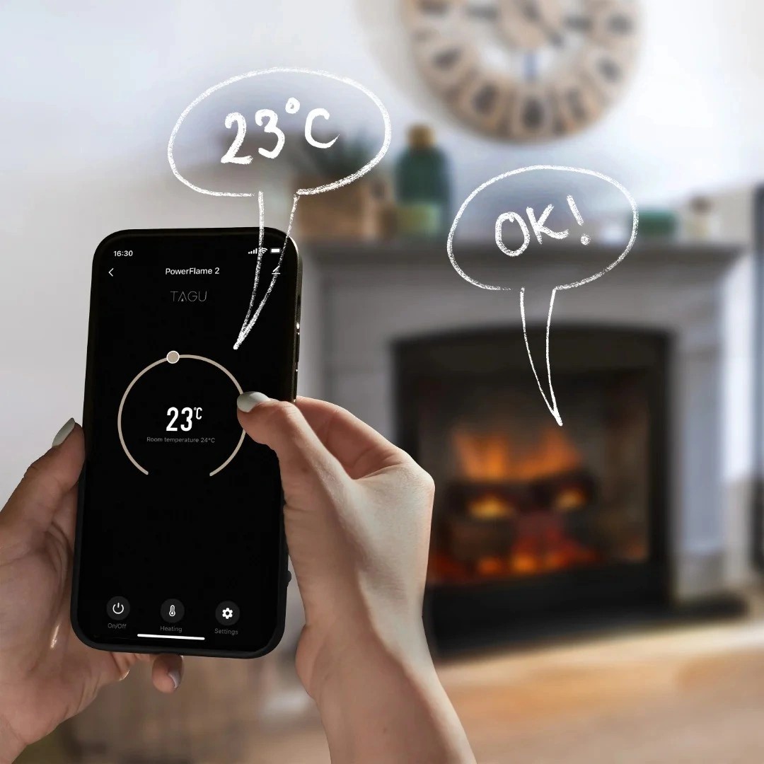 Folosește efectul de flacără cu sau fără căldură, ideal pentru orice sezon. Controlul termostatului, temporizatorul pentru somn și programarea încălzirii asigură eficiență și confort pe tot parcursul anului.
