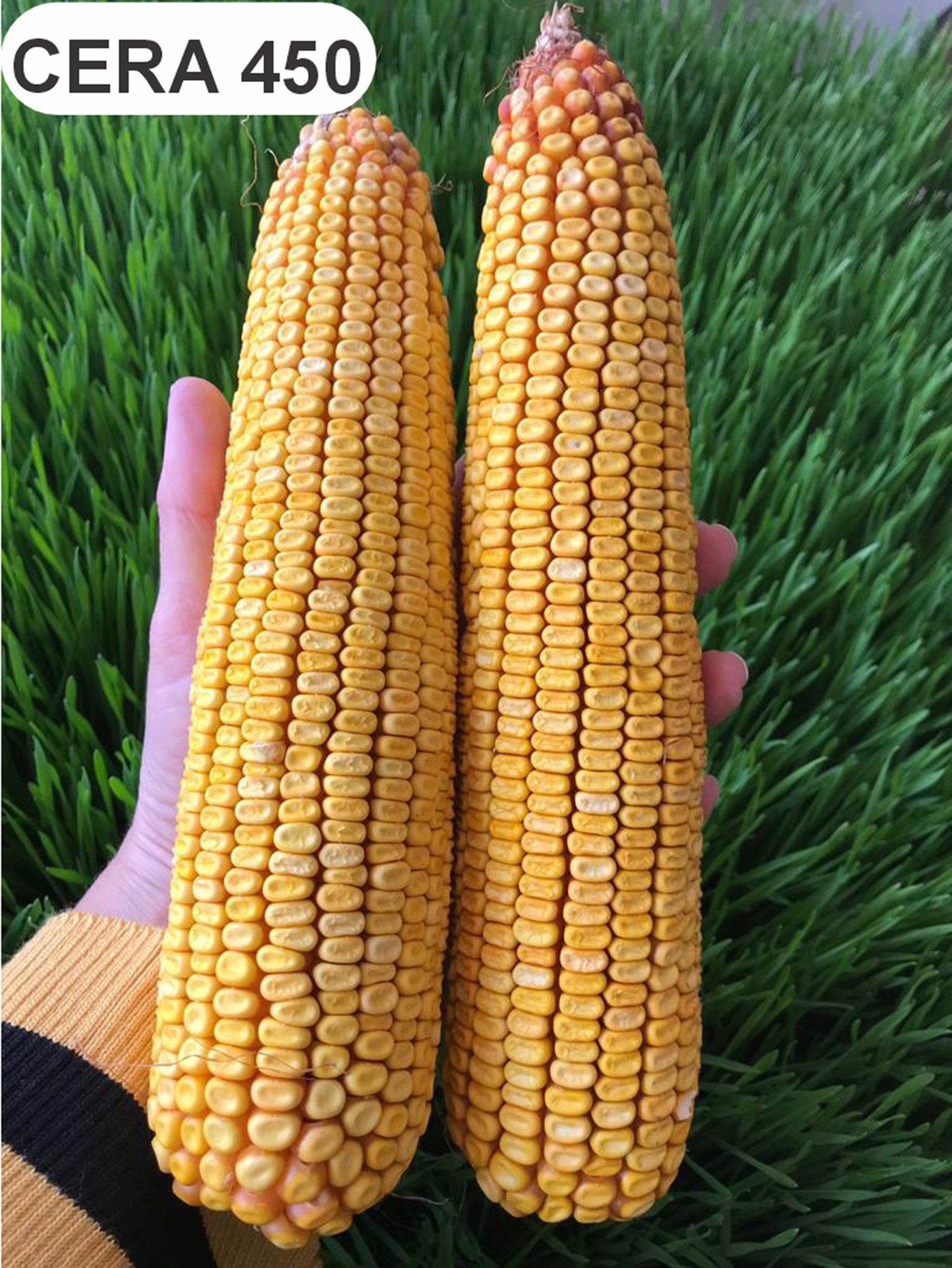 CERA 450, hibrid romanesc, tardiv, cu pornire buna in vegetatie, pretabil pentru recoltat si in stiuleti, foarte recomandat pentru siloz datorita plantei viguroase, care poate trece frecvent de 3 m inaltime.