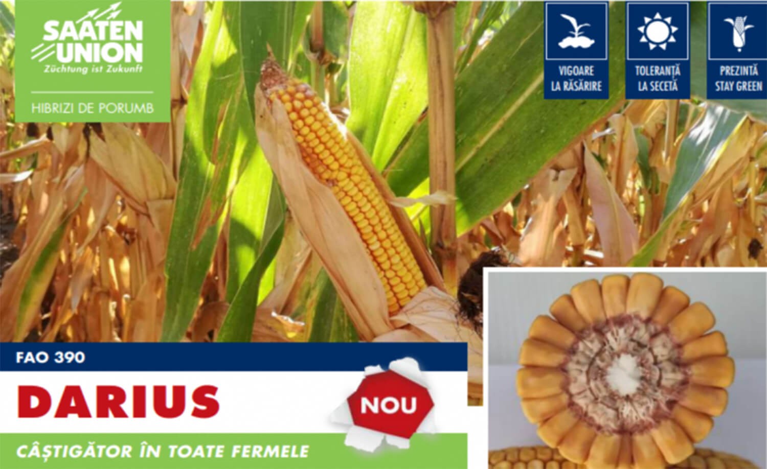 DARIUS este un hibrid de porumb destinat pentru toate zonele de cultură de porumb din România. Vigoare la răsărire și toleranță ridicată la secetă și arșiță.