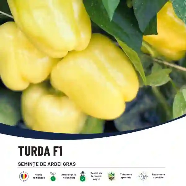 Semințe de ardei gras TURDA F1 Hektar, un hibrid timpuriu apreciat de fermieri pentru productivitatea ridicată, calitatea excelentă a fructelor și rezistența bună la boli. Ideal pentru culturi în câmp și spații protejate.